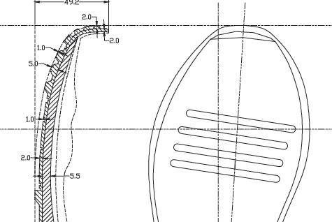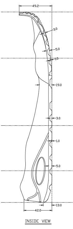The shoe outsole blue print can be the most challenging element of the shoe to design. A complicated outsole design can take weeks to design and months to model and tool up. The shoe outsole must fit the shoe upper correctly to insure the shoe fits and can be assembled neatly, And of course all the outsole parts must fit together correctly. Not so simple. Many shoe technitions help bring your shoe sole to life. The shoes Rubber sole, EVA midsole and uppers are each made by a different process and can even be made in a different factory across town. And this must be done right. A complete size run of 14 sizes of outsole/Midsole tools could be over $100,000.00 to construct. The outsole blue print shows every detail of the construction. You can see the design details and the material notes.