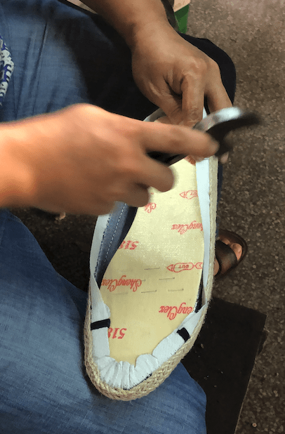 Lasting is the operation that stretches the shoe upper over the foot form or last. Almost all shoe are lasted in some way. With the last inside the upper the outsole can be bonded and pressed into place. Once the outsole is bonded the shoe can be De-lasted. There are several types of lasting operations. Slip lasting, board lasting, toe lasting, waist lasting, heel lasting, string lasting, California lasting and hand lasting.