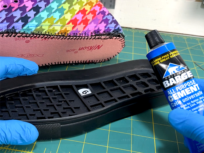 The Shoemakers Academy kit includes the option to make stronger shoes. Glue-N-Stich process: For this method you will sew the upper parts to the pink lasting board, then glue this assembly into the outsole. Then you secure the upper with the same outsole channel stitching process. This method requires a bit more time to make but produces a more durable and supportive shoe, more suitable for everyday wear.