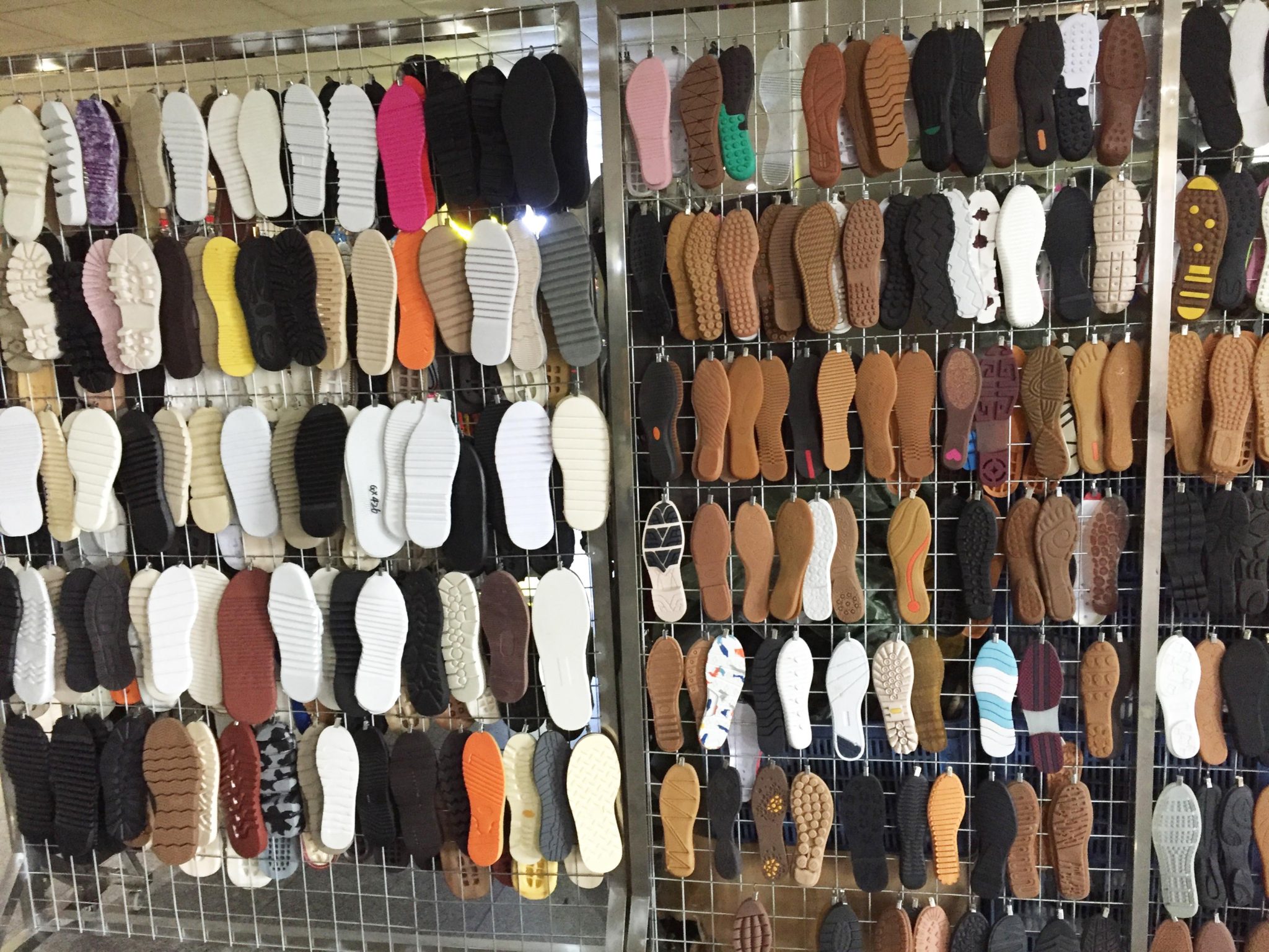 Shoe outsoles are also available in the local market.  You will find dealers with hundreds of outsole models on display.  These are “open” mold outsole units.  You can find flat treads, platform heels for women’s shoes, work boot bottoms, soccer cleats, casualShoe_Material_Market_shoe-outsoles bottoms and running shoe bottoms.   In the local market you will find “copy” bottoms of the latest shoe designs (without logos).  You cannot buy a single outsole 1 but you can order small runs of 5 to 10 units to make samples, then of course more for production.   The only issue with the local market outsole is the last bottom is already set. This may or may not work for your market.  You can buy the last with the outsoles or you can have a local last maker help you model the last to fit the outsoles.