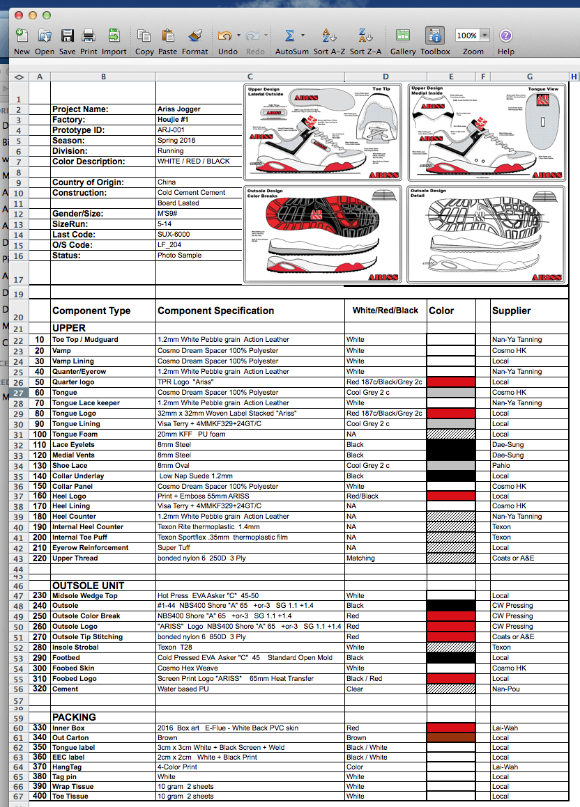 4. Complete line item shoe specification in Microsoft .xls format.
