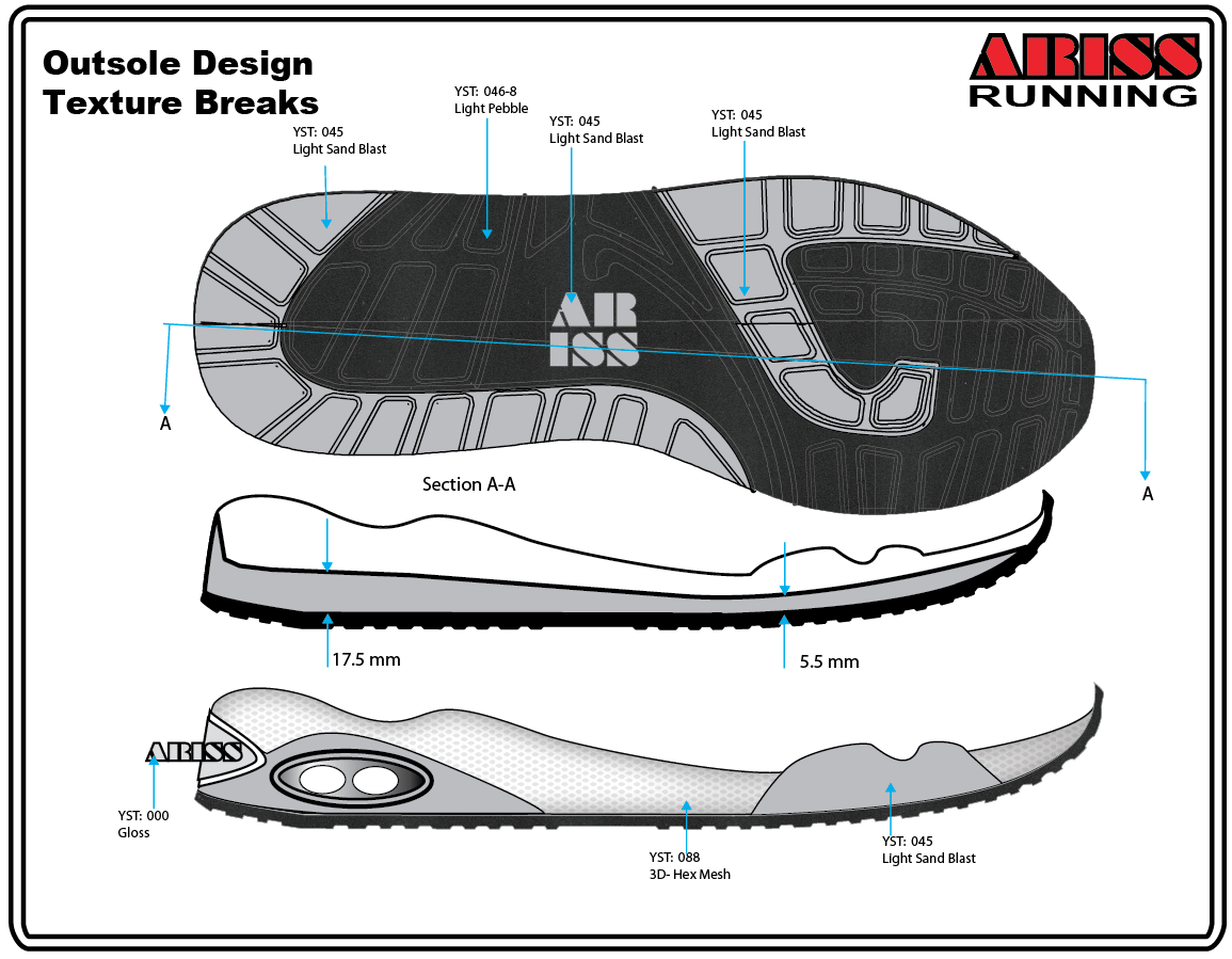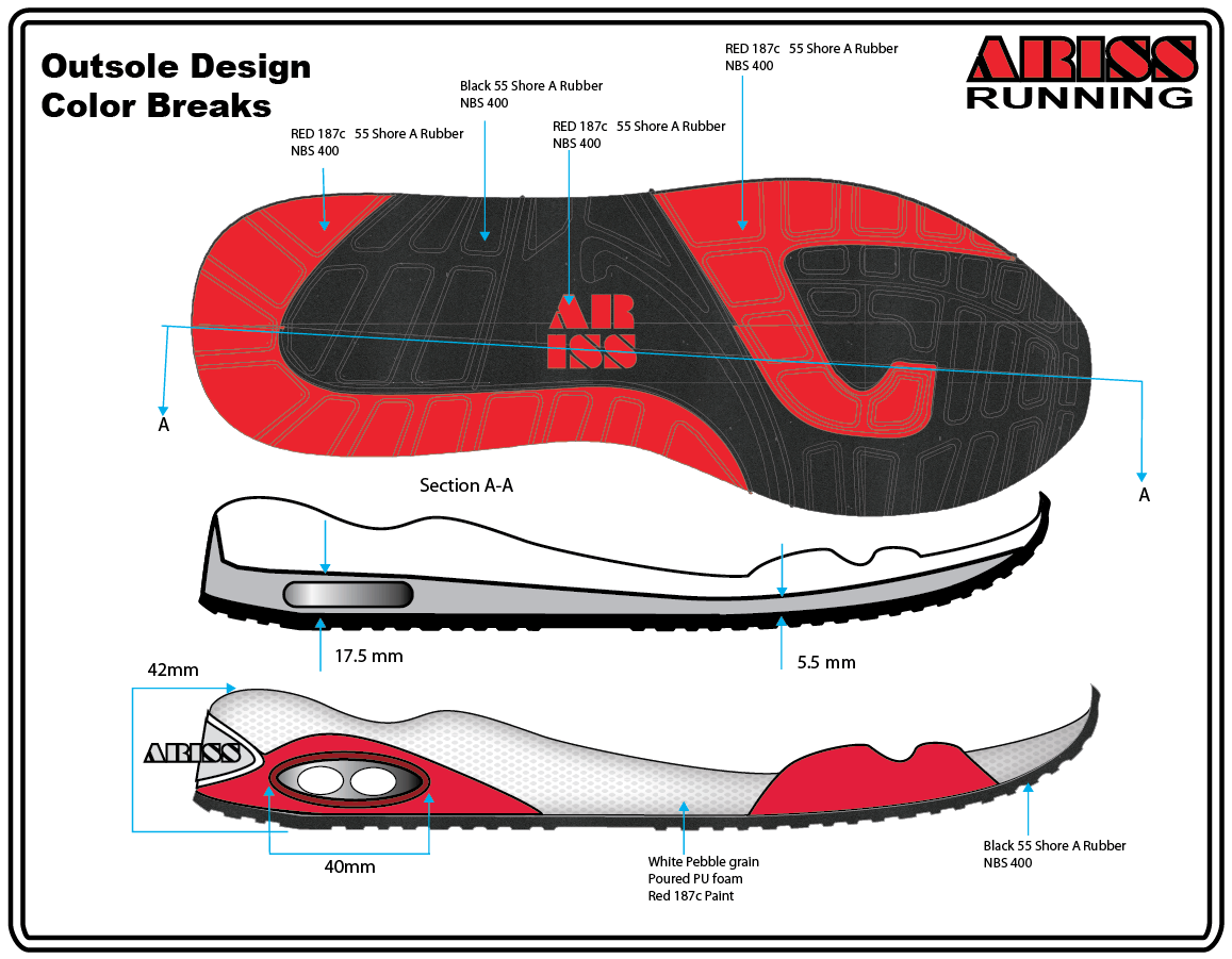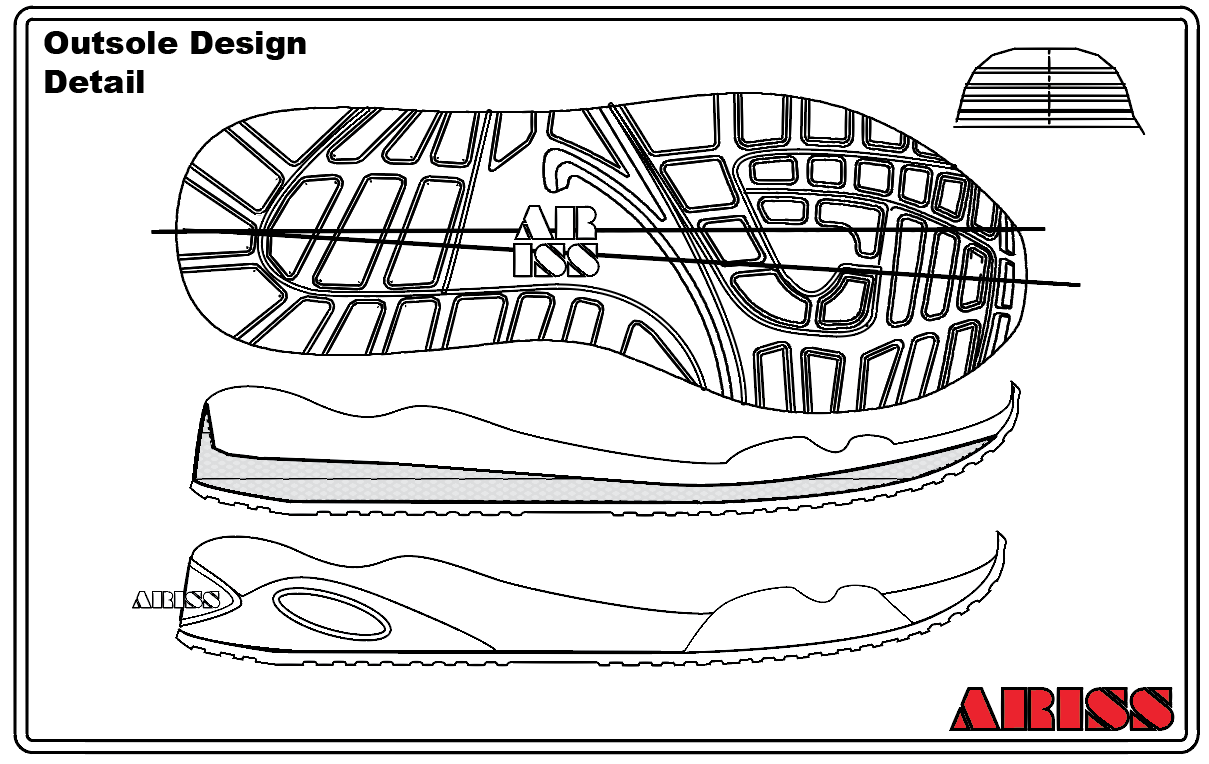 These outsole blueprints are real production drawings. Drawn by the factory mold shop in preparation for cutting the first sample outsole, they show every detail of the design, construction, and materials. The blueprints are in Adobe .pdf format and Adobe Illustrator .ai live vector file.